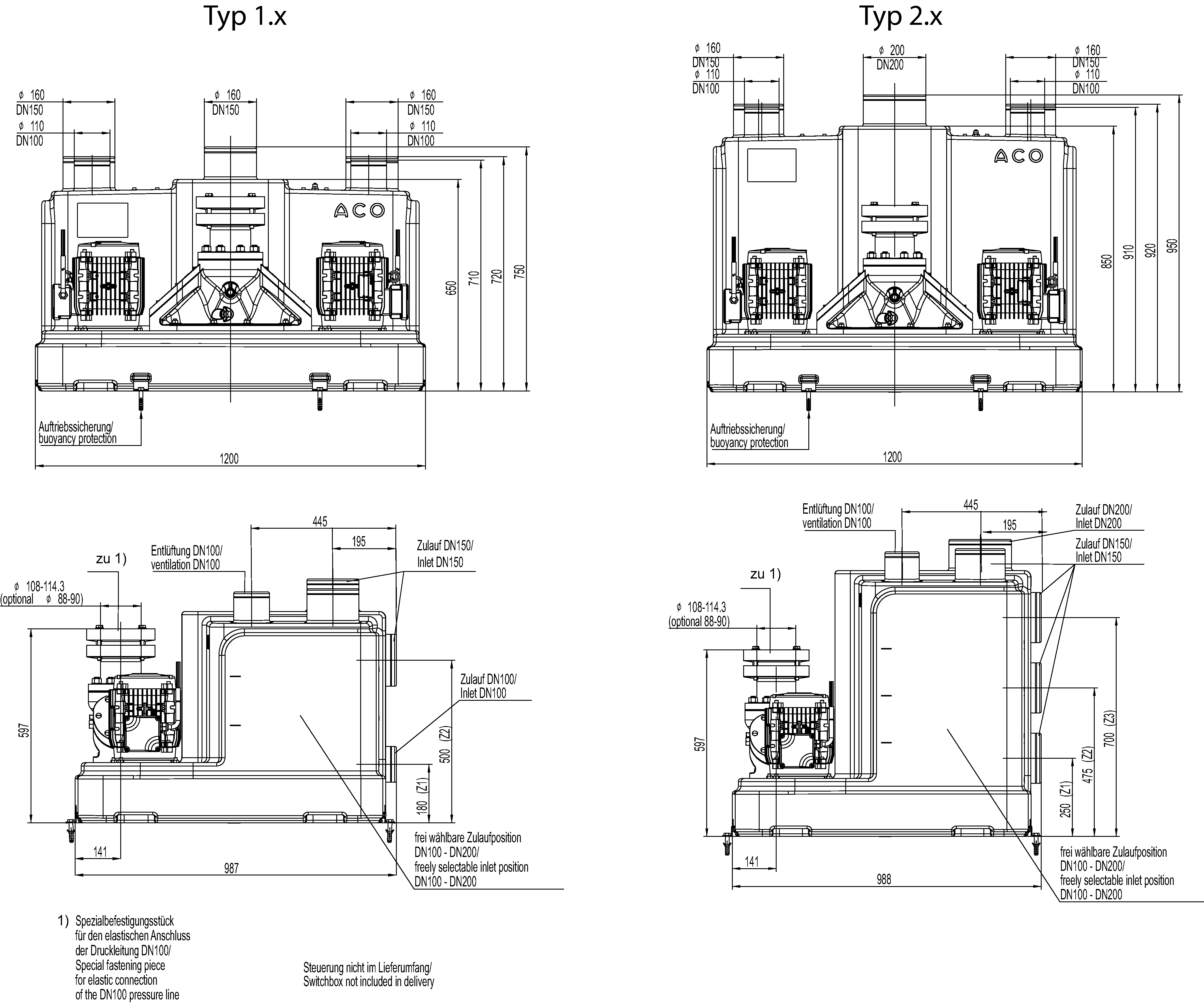 - Horizontal inlet sockets 1x DN100, 1x DN 150